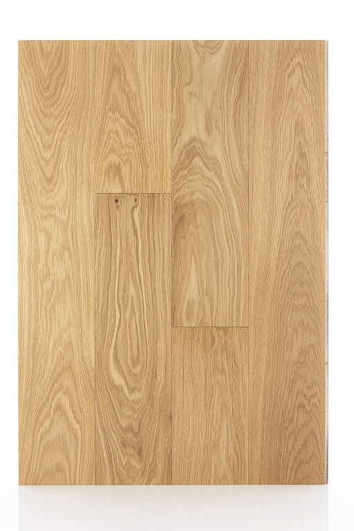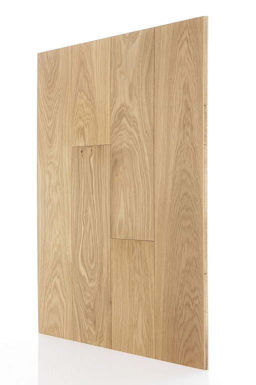 Верхний слой доски толщиной 3,3 мм изготовлен из дуба. Нижний слой – березовая фанера 12 мм. На нижней стороне сделаны стабилизирующие пропилы.